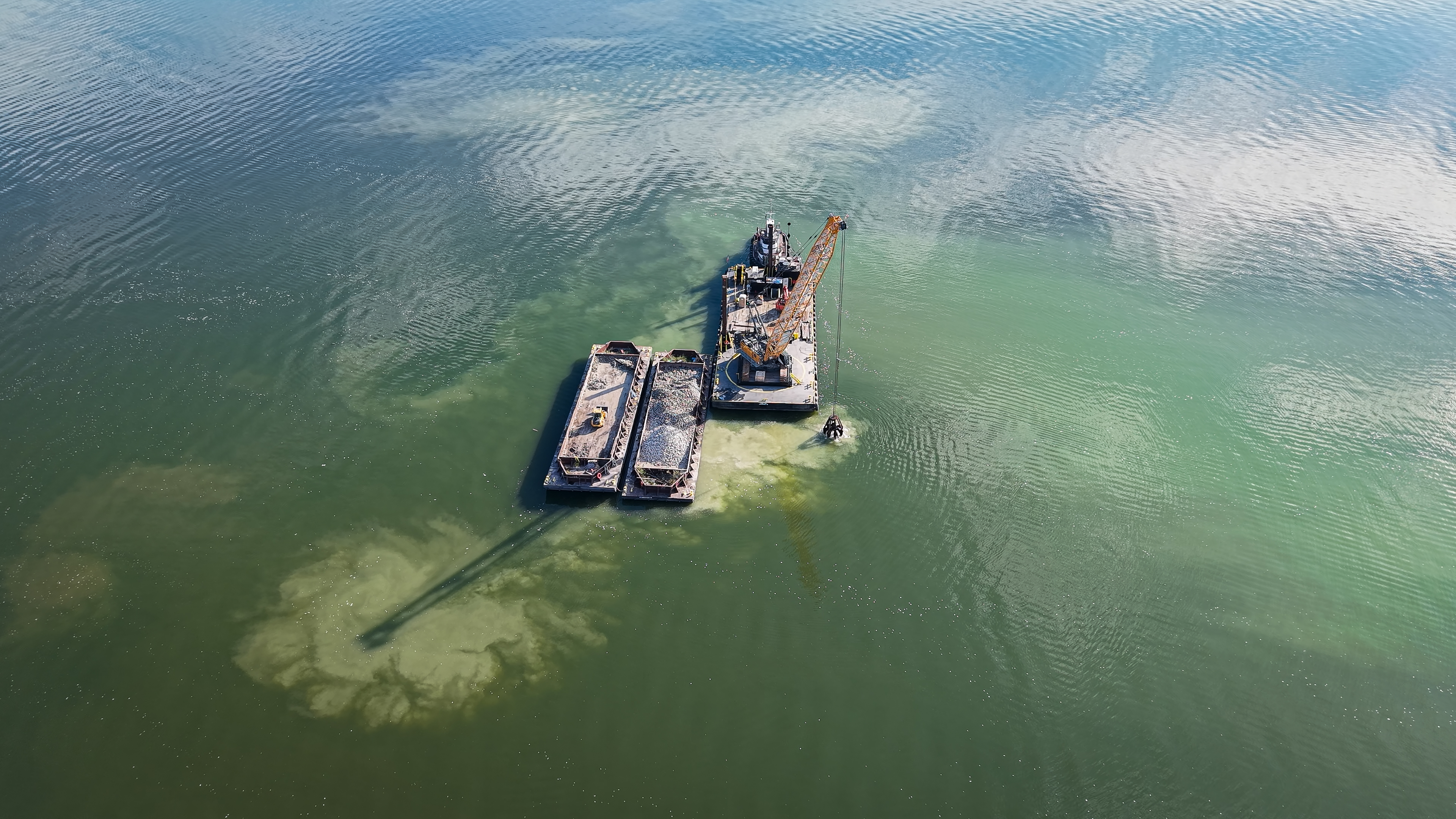 Construction of Channel Island Reef in inner Saginaw Bay, Lake Huron. The new reef replaces lost fish habitat and helps more fish reproduce and grow, supporting a variety of fishing opportunities and increasing resilience of the ecosystem to future changes. Credit: Zak Allan, GLFC.